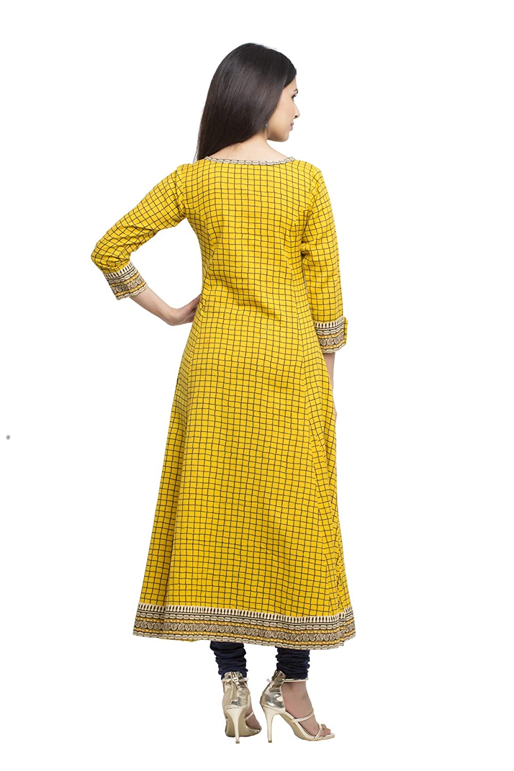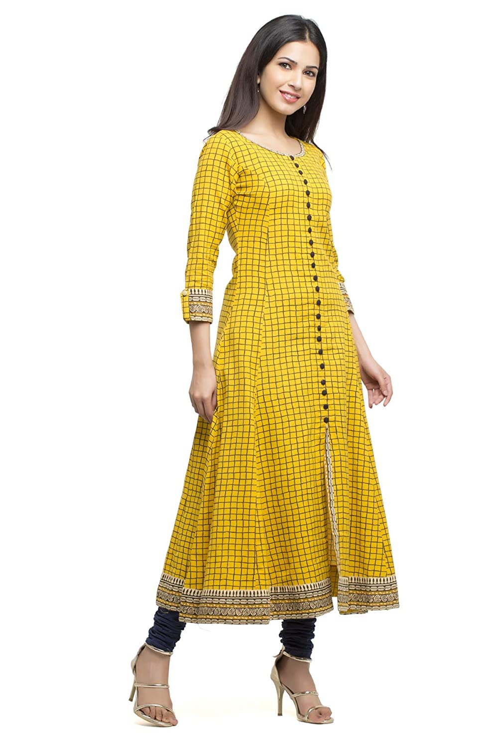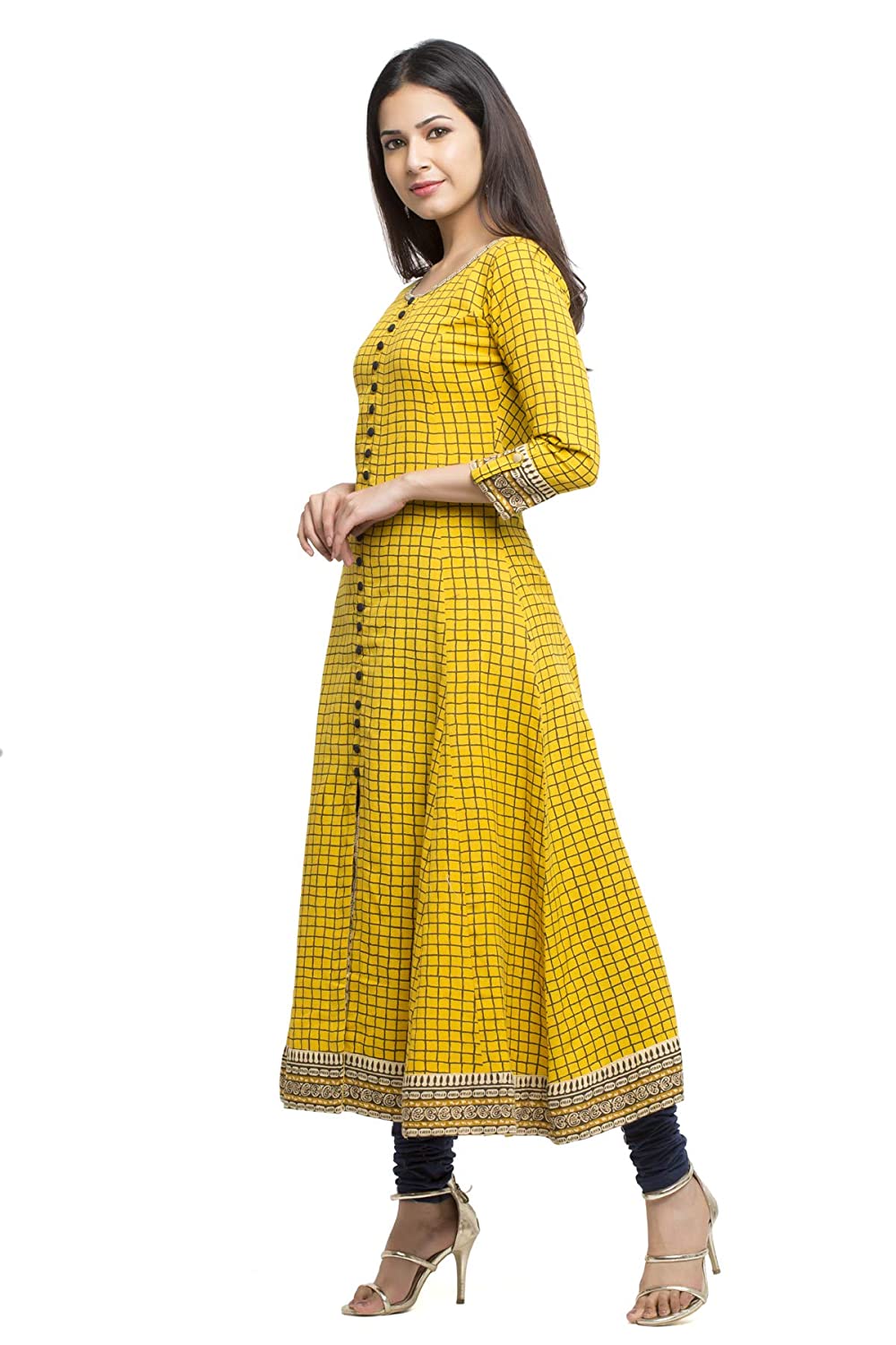 This attractive Kurti will definitely fetch your compliments for your rich sense of style This yellow checked pattern design, round neck along with button design, and three-fourth sleeves represent a beautiful flare for that perfect look. It is featured with the border at the bottom & a beautiful flare to make that stunning look. add a touch of elegance by wearing this beautiful Anarkali kurta from yash gallery.
